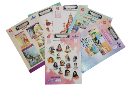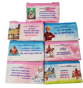A student’s pouch, designed with educational content on Saraswati Mata, friendship, and ideal life practices, making it both practical and inspirational.